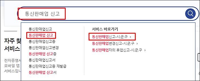 3. 검색창에 [통신판매업신고] 라고 검색을 해주세요~! 서비스 바로가기에서 [통신판매업신고 · 시 · 군 · 구] 를 클릭해줍니다