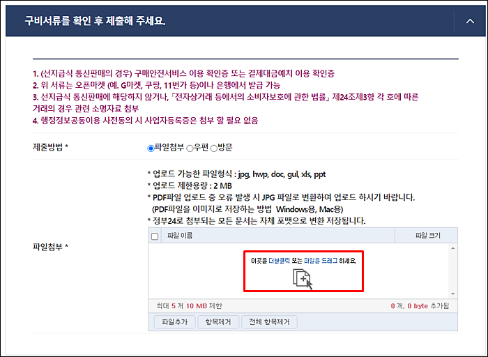 7. 구비서류에 [구매안전서비스이용확인증] 을 업로드 해 주세요.